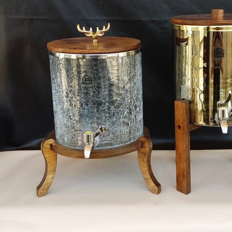 کلمن 3پایه برند ahome 5لیتری دارای ضربگیر فلزی دور لبه کلمن کار باکیفیت چوب رنگ شده کل کار ضد آب فقط با شیشه شامپاینی و شفاف موجوده ارسال به سراسر کشور عمده و تک با باربری با بسته بندی محکم